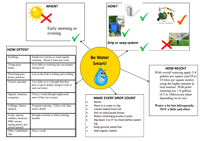 For larger crops (broccoli, cabbages etc) consider sinking an upside-down plastic bottle with the bottom cut off, at an angle into the soil next to the plant, so that water can be poured into the opening and it will go directly where it’s wanted.